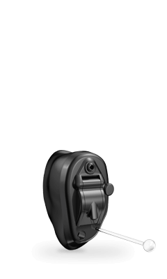 Aide auditive sur mesure qui se loge dans le conduit auditif. La partie la plus petite est visible dans l'oreille externe.